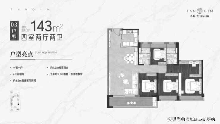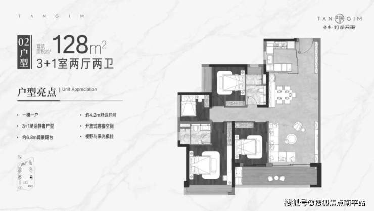 头排望公园+南海之眼核心配套,2梯2户四房三卫设计,有独立的电梯门厅,进门转角玄关,南北对流双阳台,主卧采用转角飘窗设计,比较惊艳。