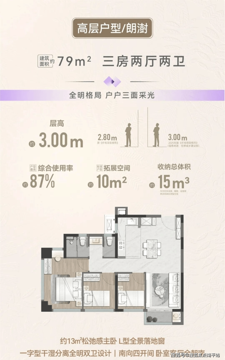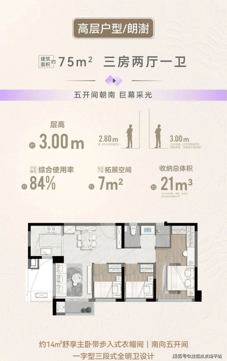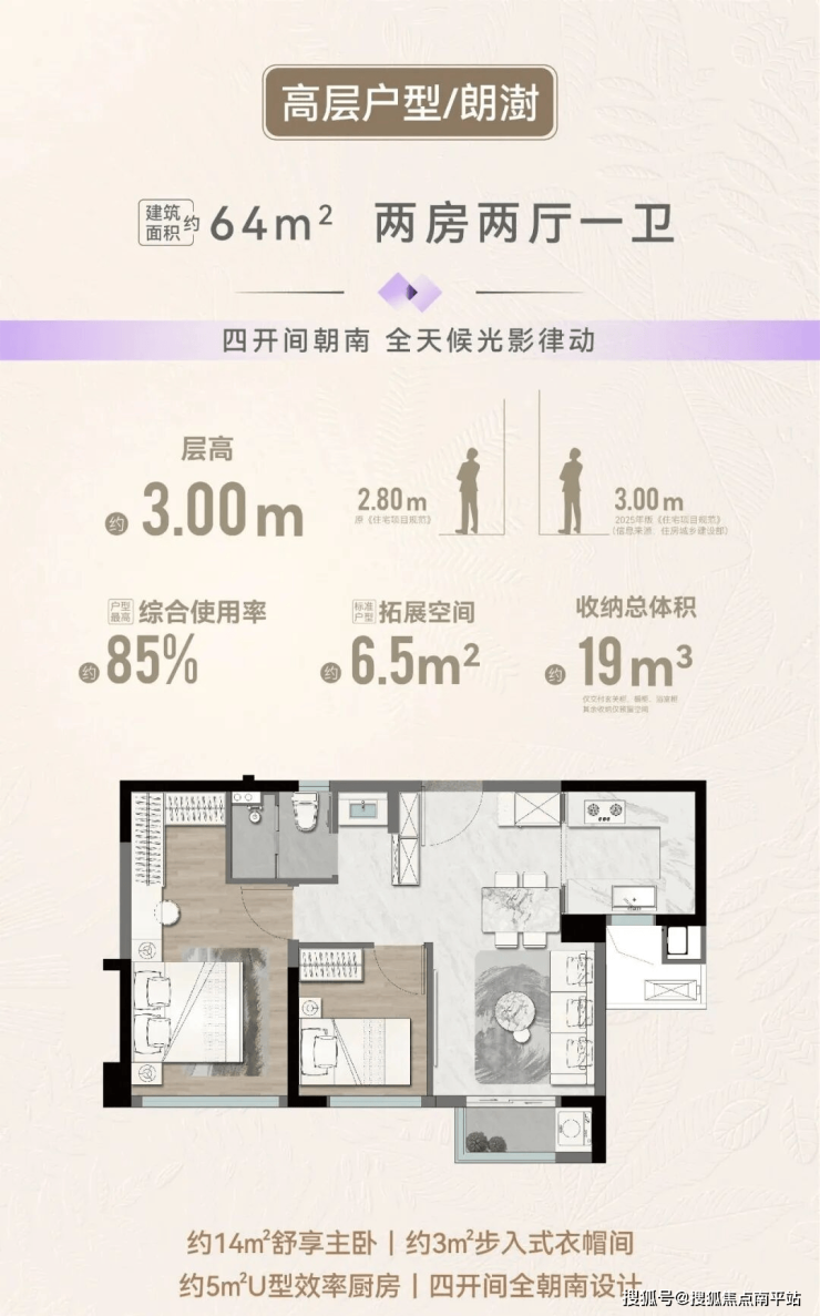 其中64㎡精装两房得房率85%,客厅卧室全朝南,主卧带衣帽间,顶配精装+智慧社区,主打小而精。