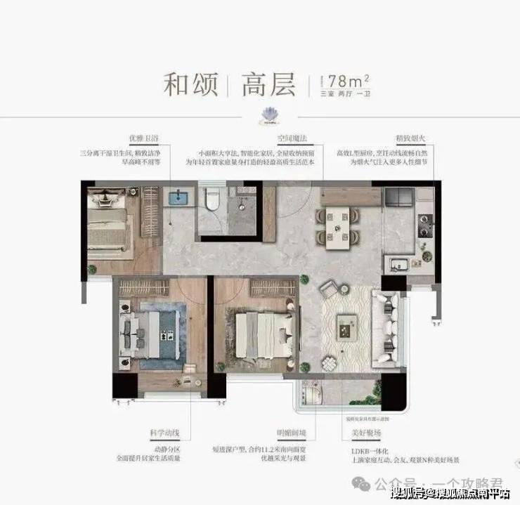 78㎡精致三房:全朝南户型,独创“3+1”可变空间,北向阳台可改造为宠物SPA间或微型花园,小户型也有大灵活。营销部☎️☎️电话:400-159-8559转接7777【☎营销部电话已认证】