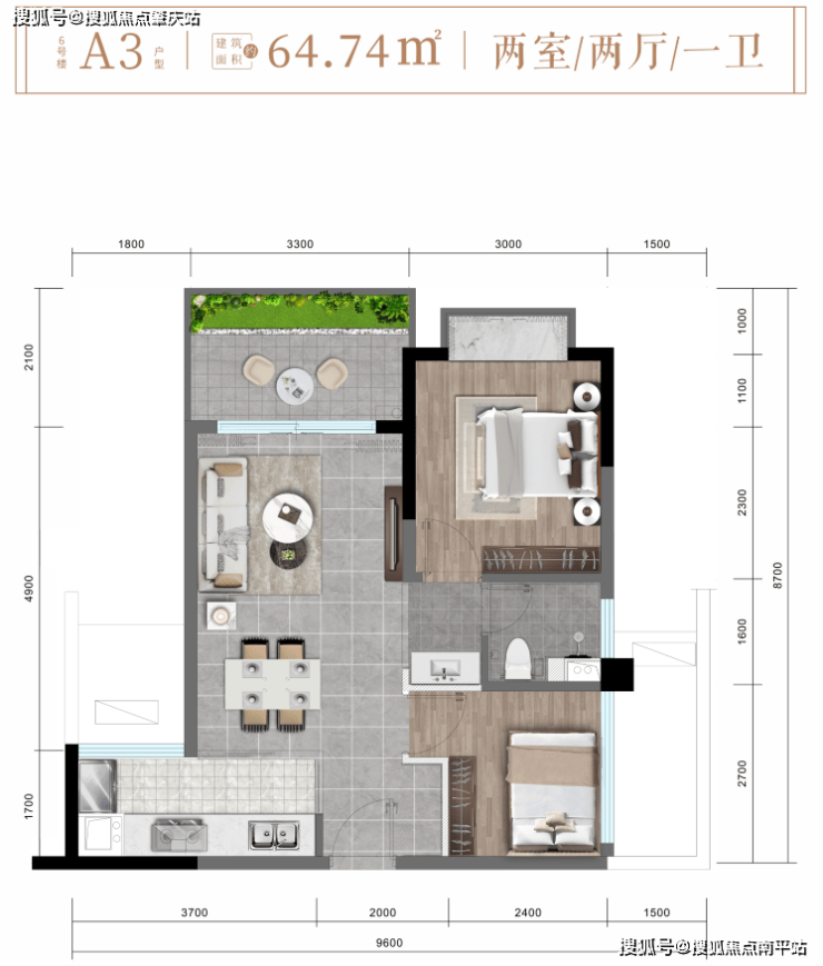 6#楼B1户型约77㎡舒适两房两厅一卫