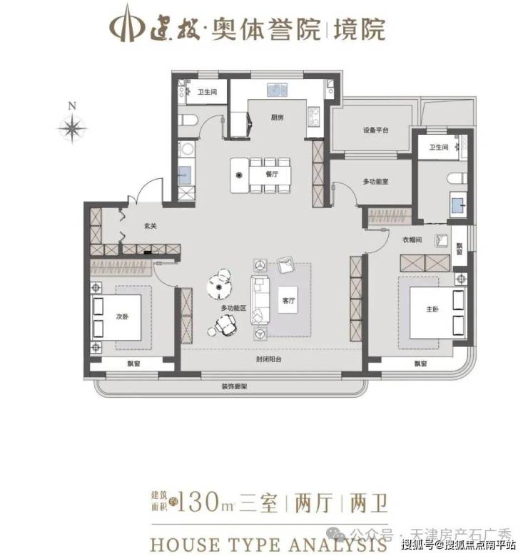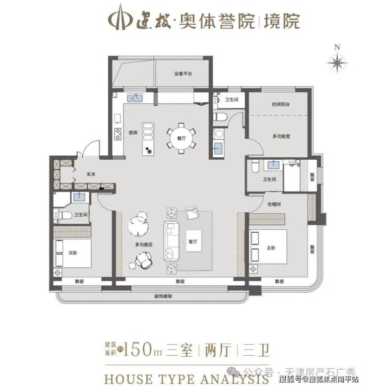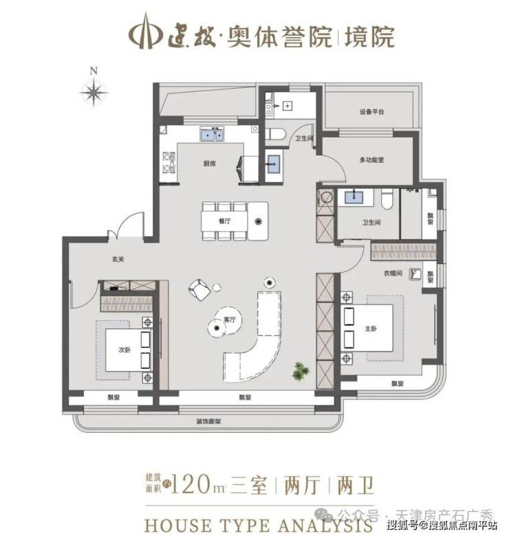 特别是 建筑面积约120㎡户型,采取的是 「方厅」结构,中央是一个 约6米×7.4米、面积 约44.4㎡的方正家庭活动空间。