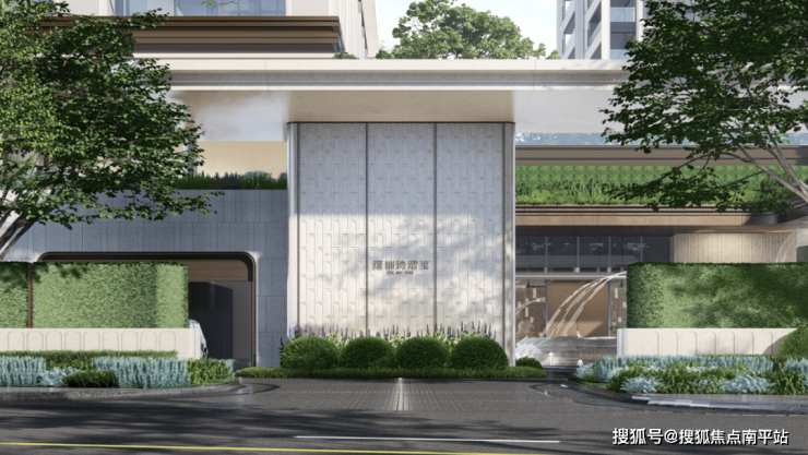 社区出入口丨车行谧邸之厅,以绿篱、景墙围合车马院,油橄榄搭配异形雕刻环岛,生境之斗打造垂直生态景观;人行水院玄关,艺术廊道配水景灯光,尽显隐奢气质。