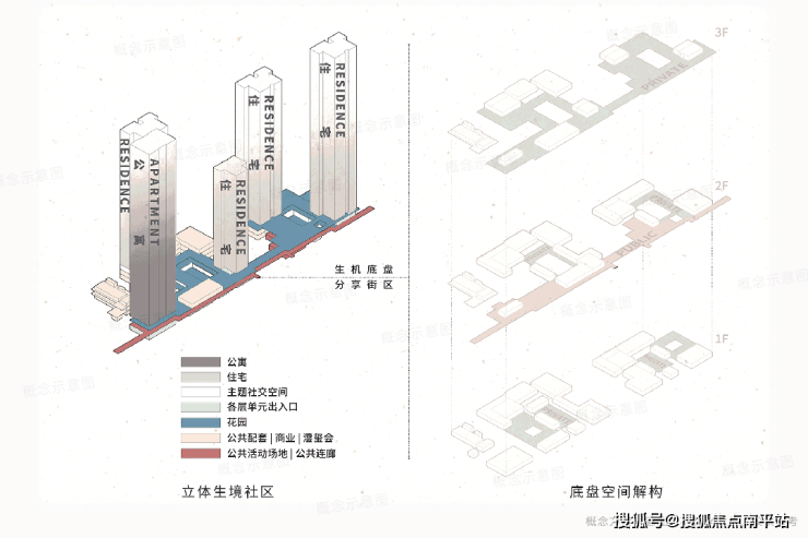 1. 整体社区概述丨立体复合的规划策略回应城市需求:通过车库、商业、社区配套的垂直叠加,在不同标高实现功能集约,并打造跨街区的空中花园系统。首层设计以内部庭院为组织核心,营造隐秘绿洲;二层环廊将通过约2公里慢行长廊(规划中)衔接城市艺术与商业;三层天际花园融汇浮岛、水景与萌宠乐园,营造出全龄共聚的度假式社交场域。