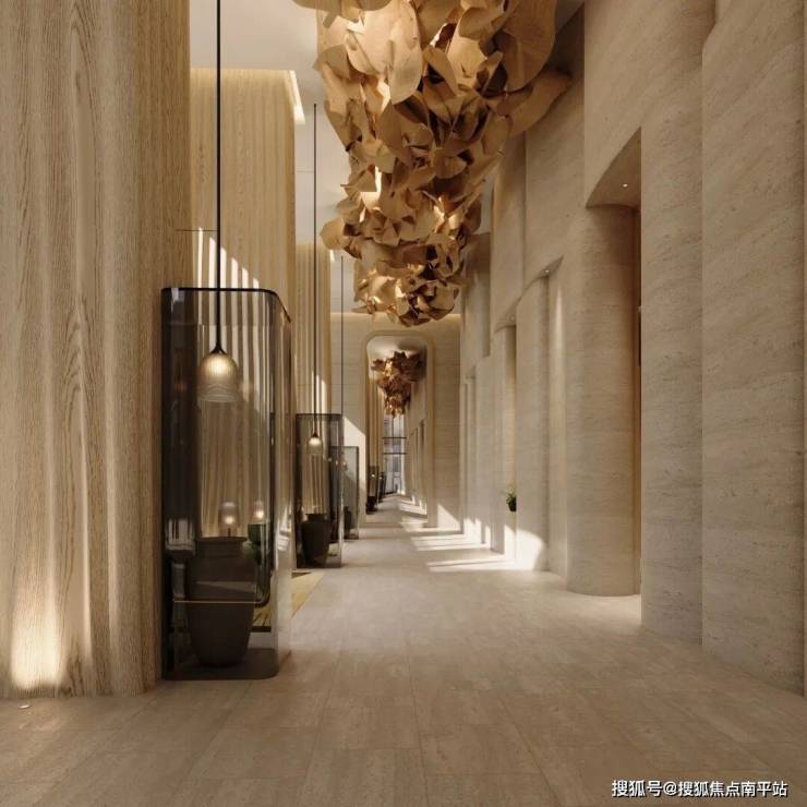 2. 精致隐奢的归家体系丨精细化设计的入口庭院标识墙,实现细胞肌理的有机延续。阔绰车马院与酒店式落客区以从容礼序迎接归家。双层通高的首层大堂空间格局、酒店式接待台奠定奢华,并巧妙转译外立面拱形元素,运用暖色系材质,塑造极具经典美学的归家第一空间。