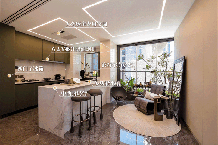 还有多功能水槽、滨特尔净水器、中西交互式岛台……这样一来,做饭也能全程保持好心情,家人间还能互动,真是太懂了。
