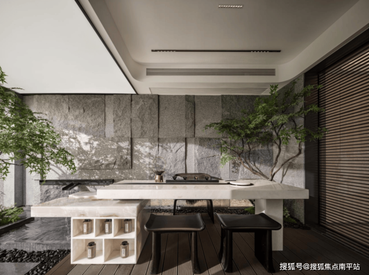它将以往别墅才有的庭院内置到L型阳台,并直接在空中院子里种树造景。