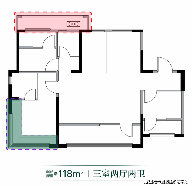 特别值得关注的还有建面约118㎡三叶草户型,使用率约为86%,其三室可改四室的设计,精准匹配了家庭成长周期需求,双明卫+三面采光的布局彻底消灭暗间,提升健康居住体验;L型主卧飘窗则巧妙地将外部生态景观引入私密空间,成为点睛之笔。