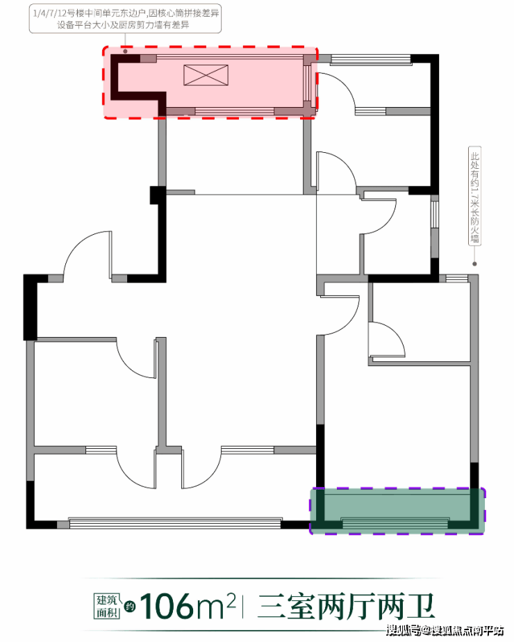 首批入市主力户型106㎡三室两卫产品,堪称性价比之王,整体使用率高达84%,若按照市面上大部分小高层产品的得房率来看,差不多可以比肩120平户型的得房率。