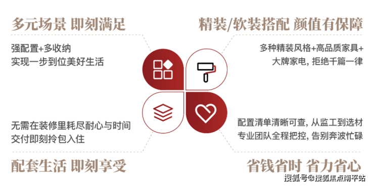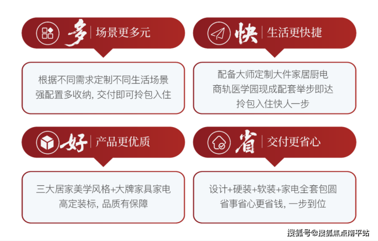 从空间的外在呈现到内在功能,从生活的物质需求到精神体验,精心雕琢“场景、生活、品质、成本”四大人居理念,深入生活的每一处细微角落,带来新一代理想人居解决方案。