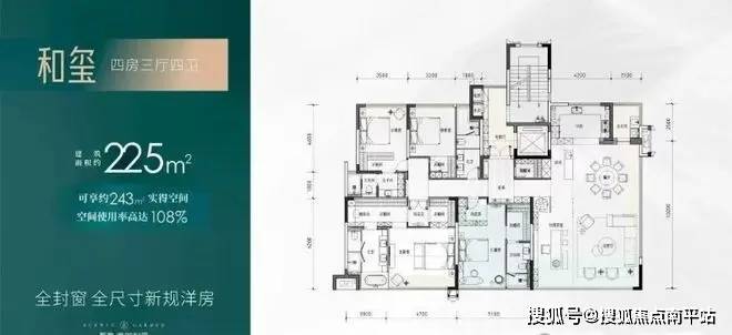 【四房两厅四卫】建筑面积约:225㎡;实得面积约:243㎡;实际得房率108%;相当于旧规286㎡!(旧规户型按85%得房率计算,仅供参考)