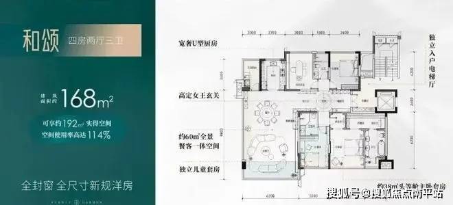 【四房两厅三卫】建筑面积约:168㎡;实得面积约:192㎡;实际得房率114%;相当于旧规226㎡!(旧规户型按85%得房率计算,仅供参考)