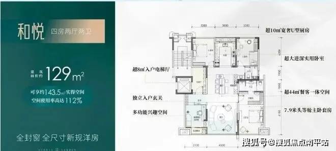 【四房两厅两卫】建筑面积约:129㎡;实得面积约:143.5㎡;实际得房率112%;,相当于旧规169㎡!(旧规户型按85%得房率计算,仅供参考)
