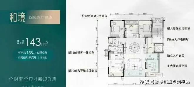 【四房两厅两卫】建筑面积约:143㎡;实得面积约:158㎡;实际得房率110%;,相当于旧规186㎡!(旧规户型按85%得房率计算,仅供参考)