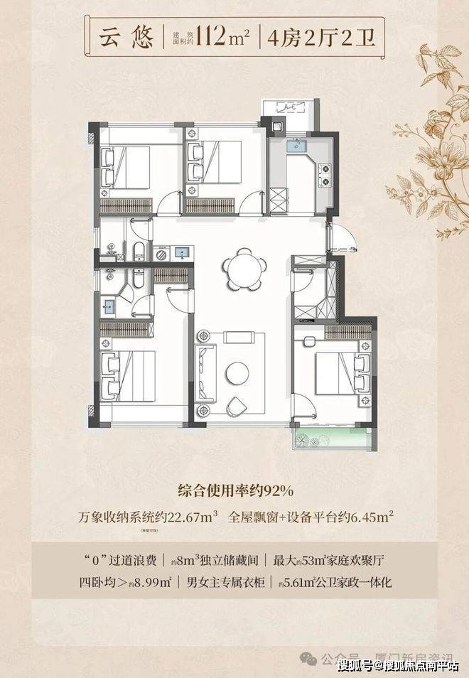 项目全1梯2户,都可以做到南北通透,约2.2容积率+纯洋房,全社区6-10层,采光大大提高,产品面积段为82-89-102-113㎡户型,共195套房源,户户综合使用率约90%。
