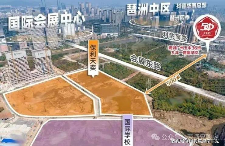 保利天奕位于广州琶洲岛南部,是去年10月30日保利以底价摘牌海珠区琶洲南区AH090402、AH090403、AH090404地块,三宗地总建面13.8万㎡,总价约59.01亿元,楼面价为4.25-4.3万元/㎡