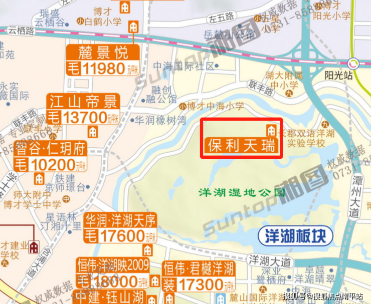 保利·天瑞位于长沙市岳麓区洋湖片区,东临长郡双语洋湖实验中学、北临瓦官口路、西临洋湖湿地公园。