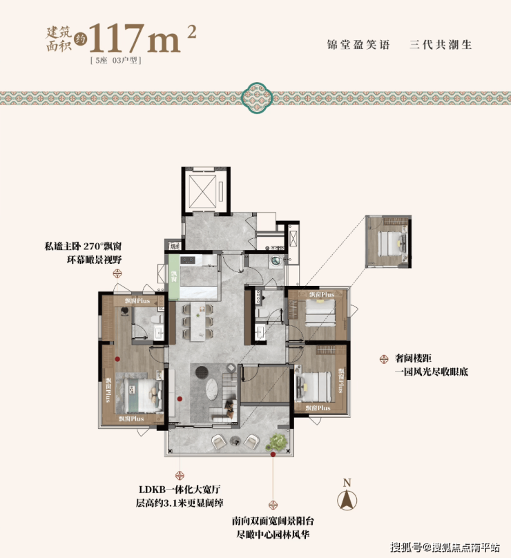 本准加推出现 117方四房,飞机户设计,客厅居于中间,卧室居于两侧;主人房以及南向次卧室都有270度景观飘窗,而且上下飘全打掉,空间实用率更强。