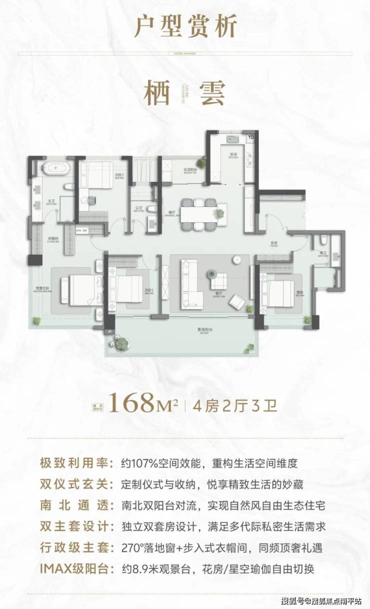 168㎡户型为139㎡A户型的升阶版,南北双阳台设计, 主阳台升级到8.9米宽,更享有 独立双套房设计,满足多代同堂需求。