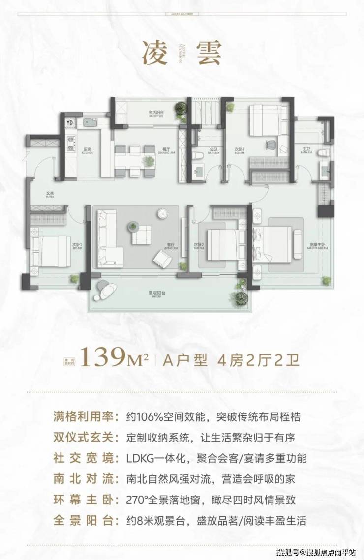 项目最小的户型—— 123㎡为四房两厅两卫设计, 使用率高达112%,奢阔尺度可媲美市面上140㎡以上户型,以南北双阳台、LDKG一体化、环幕主卧带270°全景落地窗、卧室平权为特色。