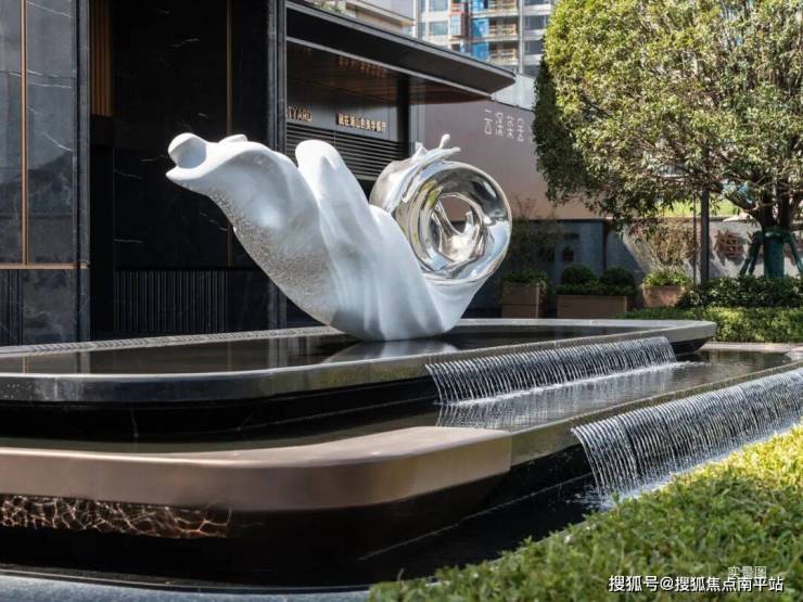 采用大面宽玻璃幕墙搭配金属铝板线条,南地块客厅转角创新采用造价更高的弧形玻璃,以更高成本、更精密工艺,保证立面的美观性,勾勒轻盈、透亮的无界天幕。