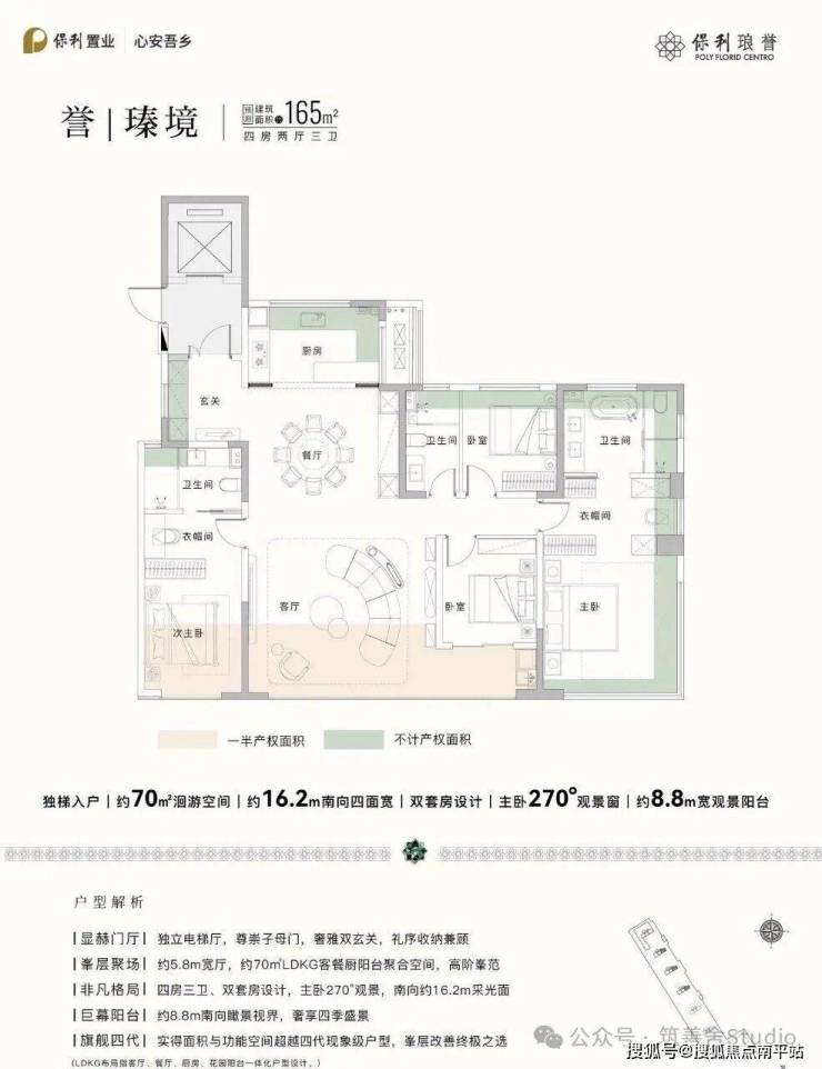 建筑面积约165㎡户型,独立电梯厅,双玄关巧妙布局,第一重迎宾玄关彰显尊贵,第二重家庭玄关收纳日常,功能与仪式在此完美交融。约70㎡LDKG空间,兼具沙龙与宴聚功能,约8.8米观景阳台,将城市风光尽收眼底,延伸生活视野与想象,静候每一次与世界的从容对话。约16.2米四面宽设计,让每个主要房间都沐浴阳光。双套房设计贴心入微,既保障家庭成员的独立隐私,又维系家人间的亲密互动。