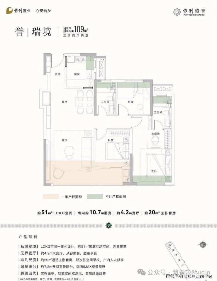 建筑面积约109平方米的三房户型,位于连廊中间位置,设计虽为常规布局,但每个房间均拥有宽敞的空间,主卧面积更是达到约20平方米。LDKG一体化设计,打造约51平方米的家庭互动空间,实现无界奢享; 约4.2米超大宽厅,从容应对聚会,尽享越级体验。 约20平方米通透主卧套房,双次卧空间均享,户户舒适享受; 约7.2米开间宽景阳台,南向IMAX级观景视野; 实得面积与功能空间双重升级,实现越级改善升级。