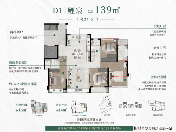 该楼栋为纯建面约139㎡产品,两梯两户的配置,保障圈层的纯粹、私密性与尊崇感。室内空间实现三面采光、LDKB大方厅、尊崇双套卧等全优空间。
