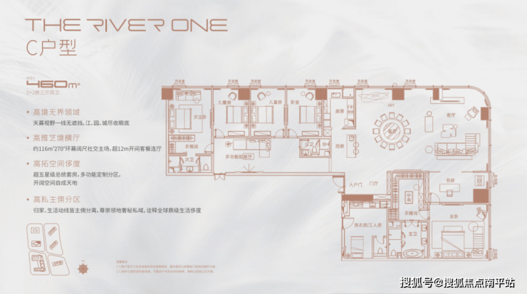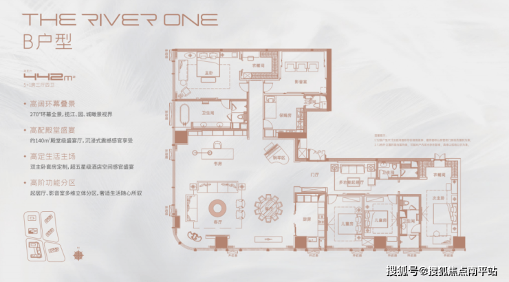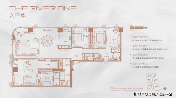 人均百平化起步:打造建面约321-1200㎡江景峯值大平层,超越墅级生活侈度。