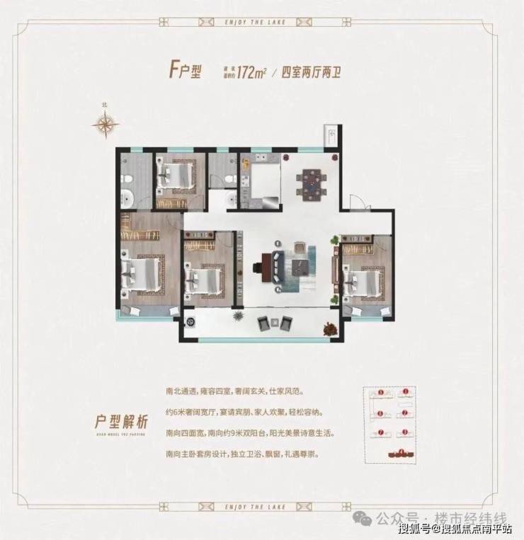 总建筑面积约8.7万㎡,总户数530户,规划2栋高层,2栋小高层,3栋洋房,绿化率35%,建筑面积约105-172㎡水岸美宅,谨献向往水岸生活的少数人。