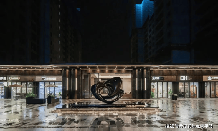 2.品质社区大门:主入口作为社区与城市接驳以及业主归家第一空间,承载了进出与识别、保护与阻隔的重要功能。璀璨学府东入口门楼整体面宽约 45 米(含商业立面),最高位建筑高度约 5.5 米。两翼舒展,同湘府英才益清小学对望,取意鸿翔鸾起,隐喻奋发有为