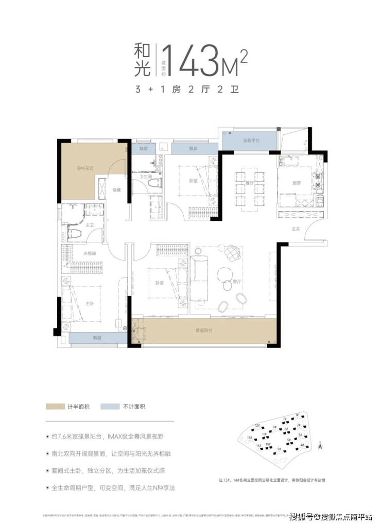 ·建面约132-143㎡3+1房——南北通透布局,南向景观阳台约7.4m(建面约132㎡户型)、约7.65m(建面约143㎡户型),即满足从容会客,亦承载家庭逸趣,约3.8㎡独立玄关入户,扩容收纳空间,U型厨房设计,操作动线流畅,将舒适度发挥到极致