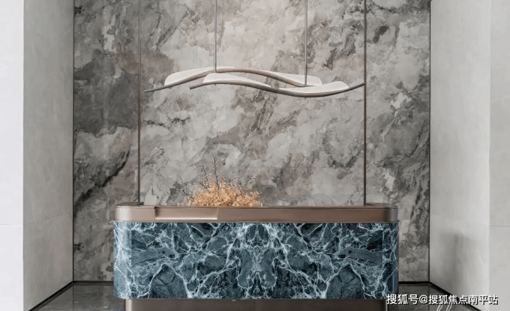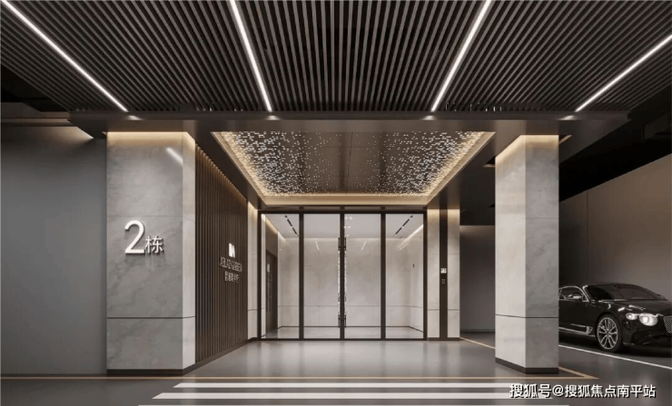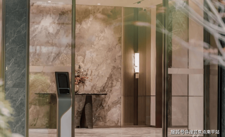 1.出入归家礼待:东入口社区大堂面积约120㎡,层高约5.5米(装修后约4.7米),墙面为瓷砖通铺,地面为石材微缝拼接,右侧通过大面岩板+天然云石壁灯渲染酒店式归家氛围;楼栋入户大堂采取电动对开门设计,层高约3.6米(装修后约3.1米),悬浮吊顶,墙面及地面通铺“简一(900*1800)”瓷砖,充分运用光影变化、艺术点缀、高贵建材等手法强化了精致的空间美学,匠著更契合业主的学府生活方式