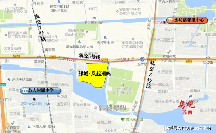 周边 3、5、7号线三轨交汇,3站即达苏州中心,北侧紧邻金鸡湖大道,往西直通古城、往东直达湖东。