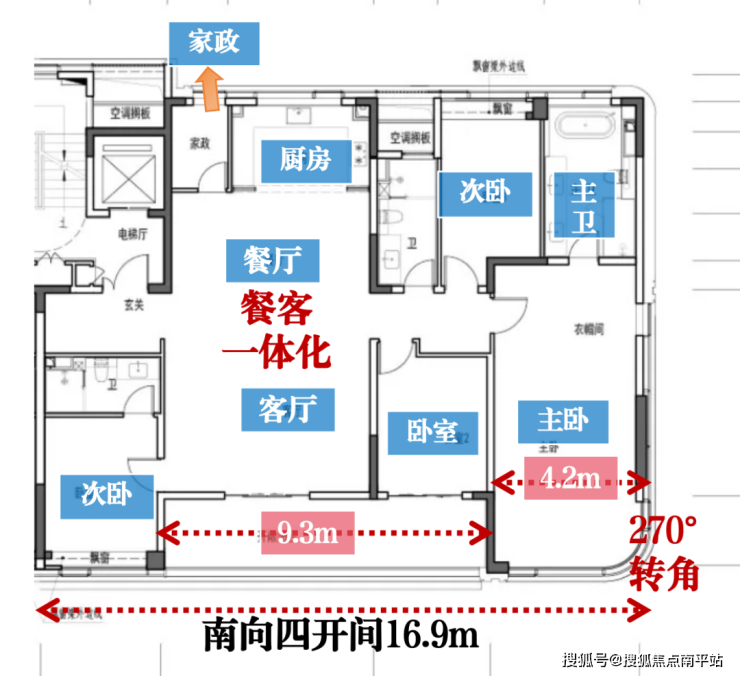 户型方正,四开间朝南,奢阔南向面宽达约16.9米,尽显空间掌控力;约9.3米南向贯通阳台衔接6米客厅;南向3个卧室均采用大面宽设计,采光与舒适兼得。