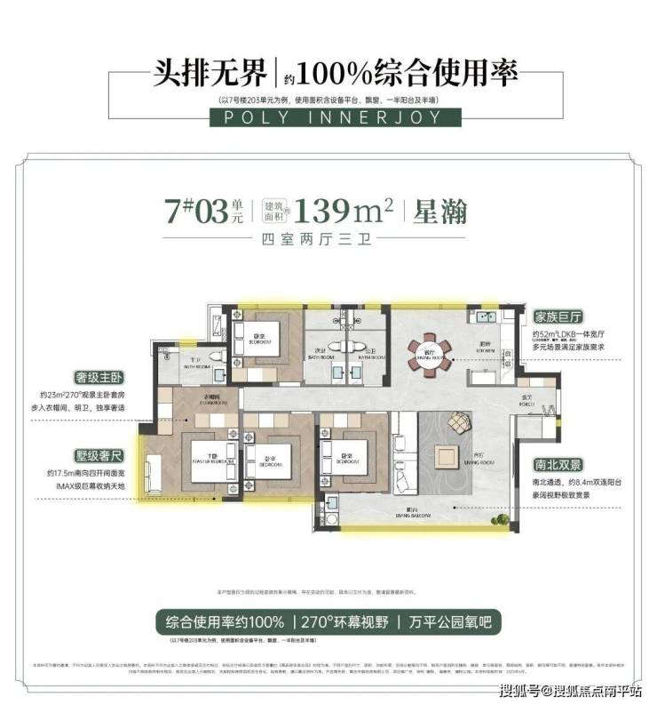 保利·瑧悦|观樾仅余7#公园首排瑧席待藏,清栋倒计时的钟声已然敲响,约“0”公摊大四房(以7#203为例,使用面积含电梯厅、设备平台、飘窗、一半阳台及半墙),建面约139m²实用约137m²,此刻入席即是封藏!