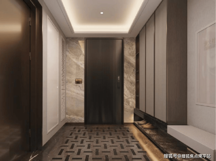 传统独立电梯厅常因水电暖井、消防设施布局而空间割裂。针对此痛点,君安深入研究业主使用习惯,精细调整设计布局,预留出完整墙面空间。业主可自由规划,或打造通顶鞋柜衣柜,或设置洗衣消毒区,完美兼顾收纳与入户除尘,营造媲美安缦酒店的归家仪式感。