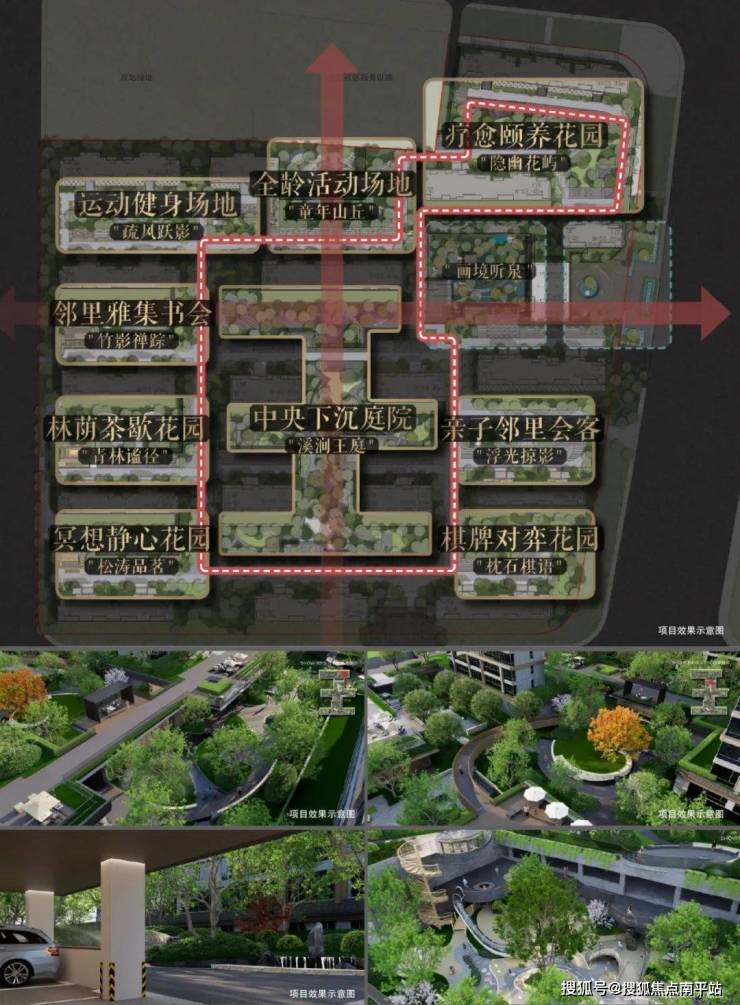区别于仅具装饰性的局部下沉设计,君安在严格保护泉脉前提下,创新打造了贯穿整个园区、面积超7600平米的大型核心下沉庭院。以此为景观中枢,精心构筑“两轴一环九重礼序”的生活场景空间。
