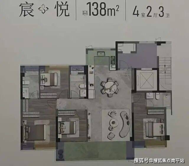 入门户型是138平米的四房三卫,认真看这个户型,和传统的四房三卫有不同之处;