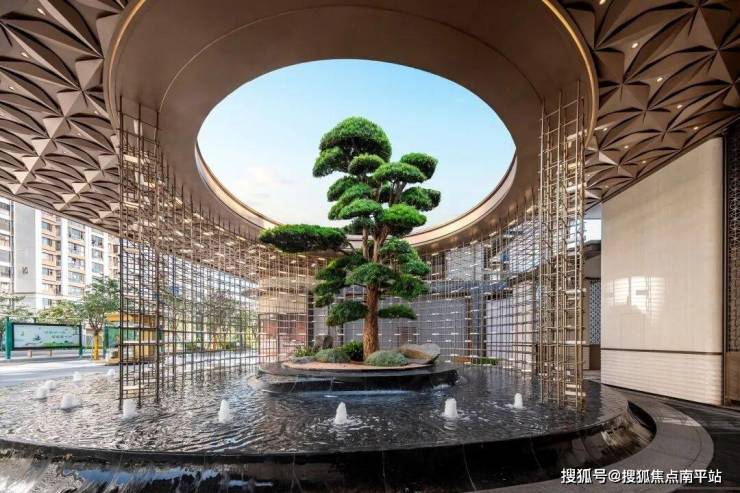 入口中央,一棵 罗汉松 ,经由定制亮化雕塑精心包裹,顶面采用金属高定树叶造型,光影流转间,归家的仪式感已然拉满。