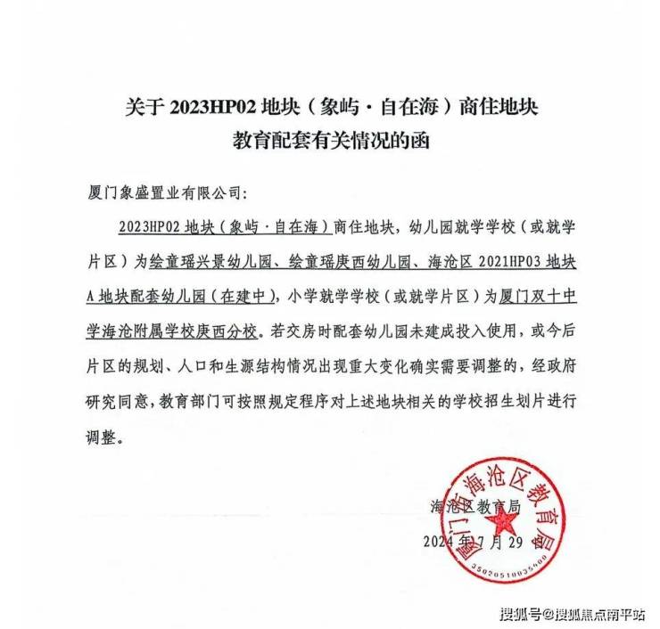 2024年7月29日,海沧教育局发函明确,象屿·自在海(2023HP02地块), 幼儿园就读于绘童瑶兴景幼儿园、绘童瑶庚西幼儿园、海沧区2021HP03地块A地块配套幼儿园(在建中);小学划片就读厦门双十海附庚西分校。