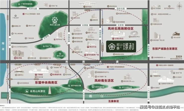 以甄选一二线及省会城市的极核地标板块为择址原则,南宁邦泰·璟和落子民族大道上的凤岭北。从麻村至南湖,从南湖至凤岭北,顶流繁华商圈、高级酒店、5A甲级写字楼、高端住宅区围绕在两侧,一路向东的民族大道不仅见证了南宁四十六年的近代城市发展,更是见证了凤岭北这片土地的二十年崛起之路。 如今的凤岭北,板块能级高配套成熟,周边“学铁商”齐全,区域价值不言而喻。