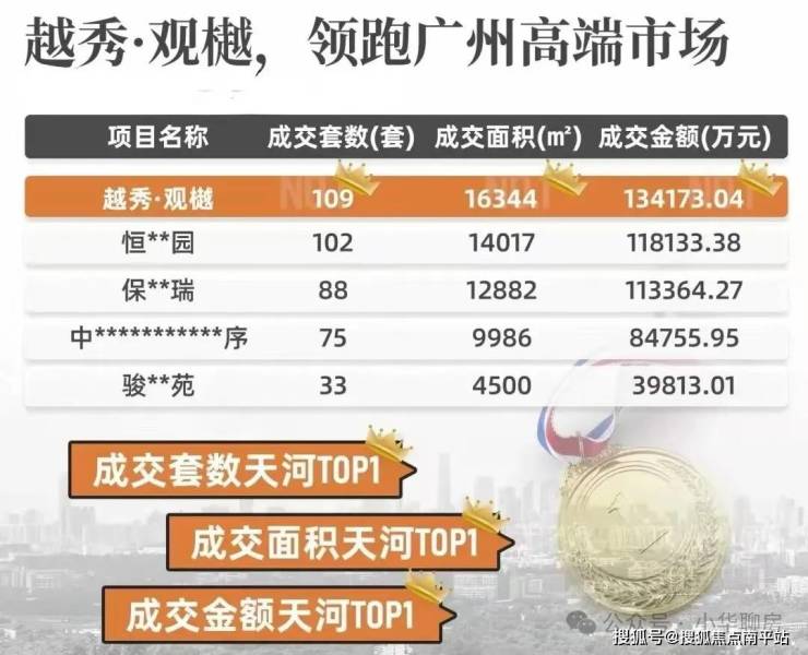 特别是越秀·观樾3月首开成交15亿,这在当时冷淡的市况下尤为难得,由此一炮而红,迅速打开市场。接下来,五一热销约5亿;端午热销约3.6亿;7月加推1栋当天去化超5成……4开4捷,几乎是霸榜广州豪宅热销战绩,堪称“断货王”。据克而瑞数据统计,首开以来,项目斩获天河区1000-1600万总价段的"三冠王"(涉及套数、面积、金额成交),挤进天河“高端局”顶端。