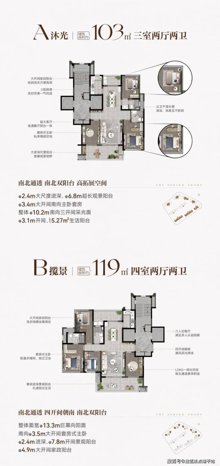 项目规划建筑面积约103-238㎡改善户型,层高最高约3.05m,南北通透、双景观阳台、南向多面宽,于一方宽境里,满足对阔绰空间与舒适格局的拥享。
