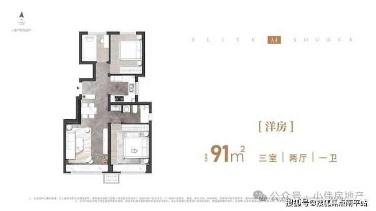 🔥A户型|洋房91㎡三室两厅一卫: