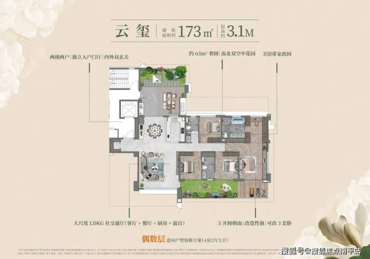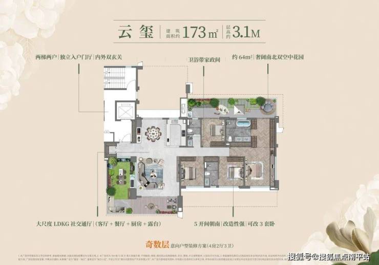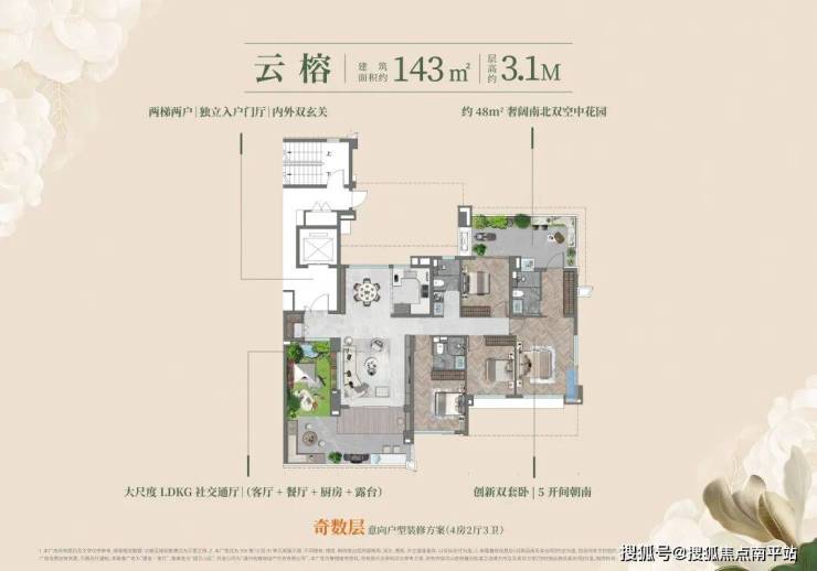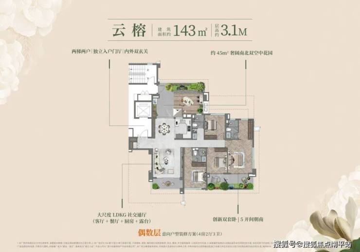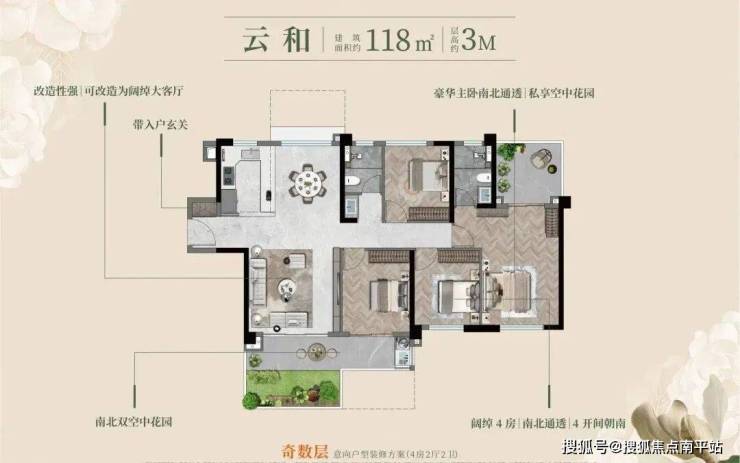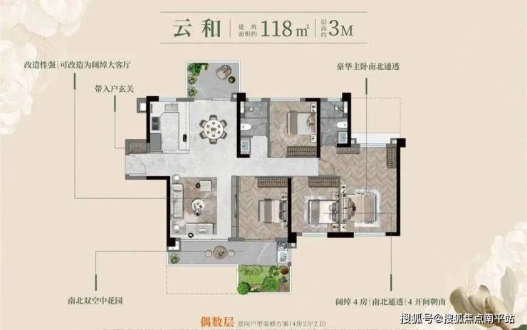 中大型户型侧重 “功能复合”:118㎡户型设计双花园入户(南北各一,合计赠送约 31㎡),可改造为 LDKB 一体化空间,主卧可衔接花园露台;143/170㎡大户型则强化 “大平层体验感”,空间改造灵活性较高。