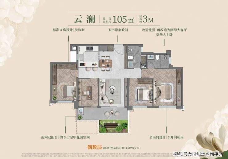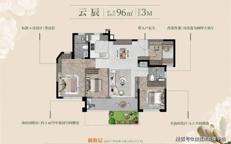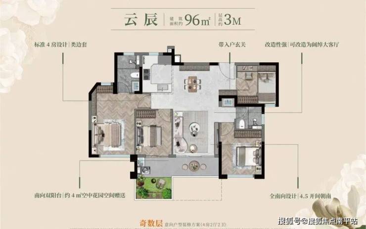 小户型侧重 “空间扩容”:95㎡户型实现 4.5 开间朝南,赠送约 26㎡空间(相当于一个标准主卧),实际使用面积接近传统住宅 128㎡;