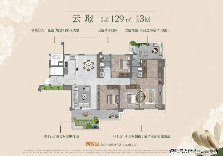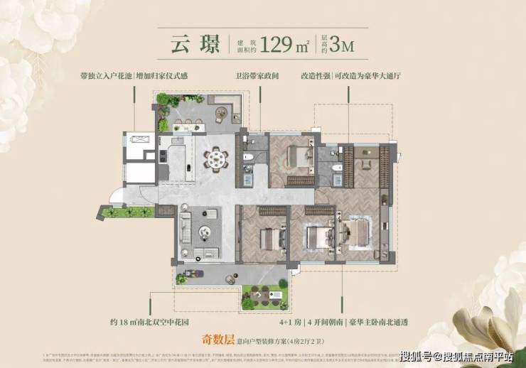 户户均为端套设计,全户型四开间及以上朝南,部分户型层高 3-3.1 米(高于传统住宅 2.8-2.9 米的标准);