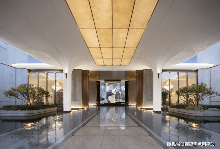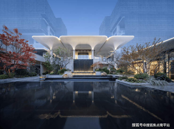 依托“超级底盘”设计,社区整体抬升约6.5米,由此形成了视觉错落感的下沉式庭院。 黑金砂光面仿石砖铺就的步道浮于水面,平整如镜,与水、景、人自然交融。