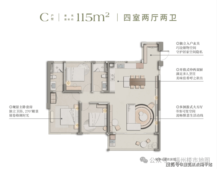 115平四房两厅两卫产品(31套):楼高32层,层高2.9米,底层架空,两梯四户,东端头户型,公摊23.2%;楼层差110元/平左右,备案区间价格2.85-3.28万/㎡,总价327-376万/套。
