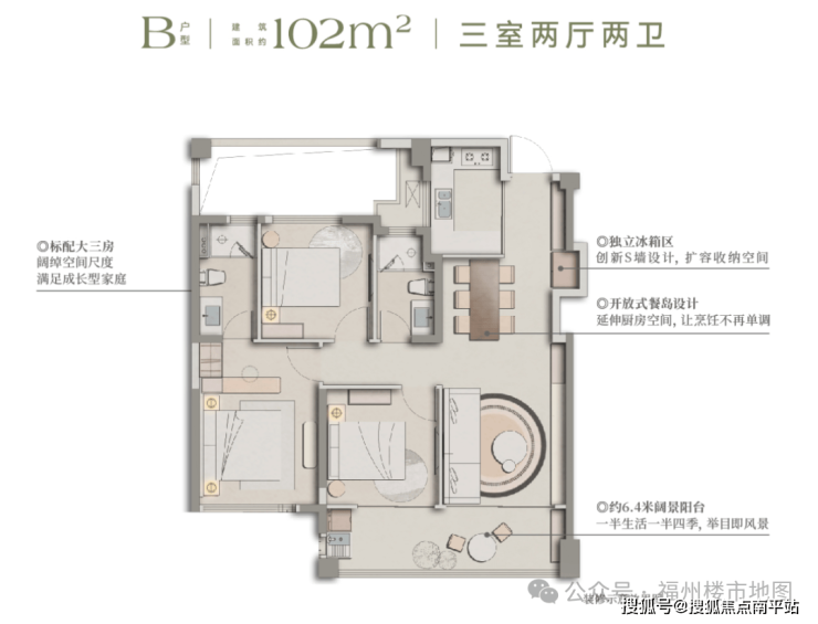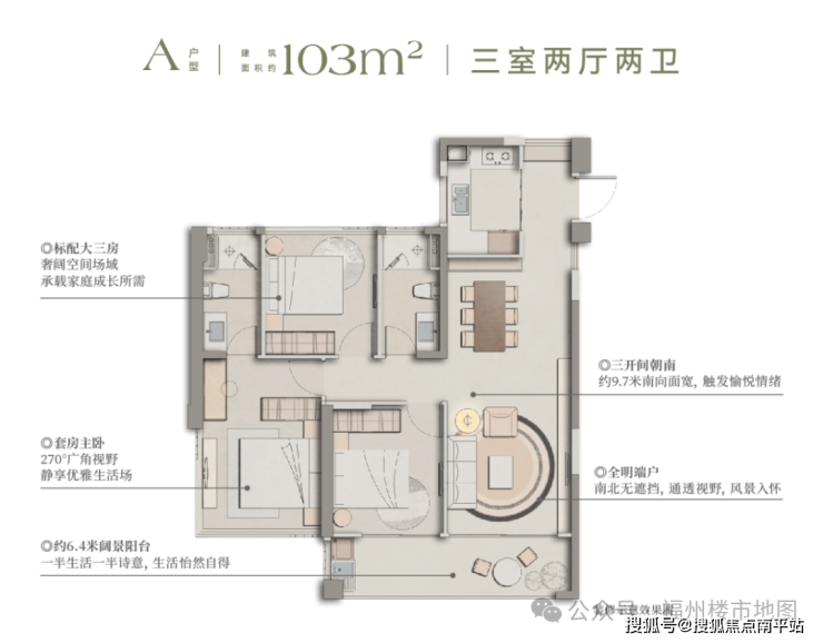 103平三房两厅两卫产品(31套):楼高32层,层高2.9米,底层架空,两梯四户,西端头户型,公摊23.2%;楼层差110元/平左右,备案区间价格2.82-3.23万/㎡,总价290-332万/套。